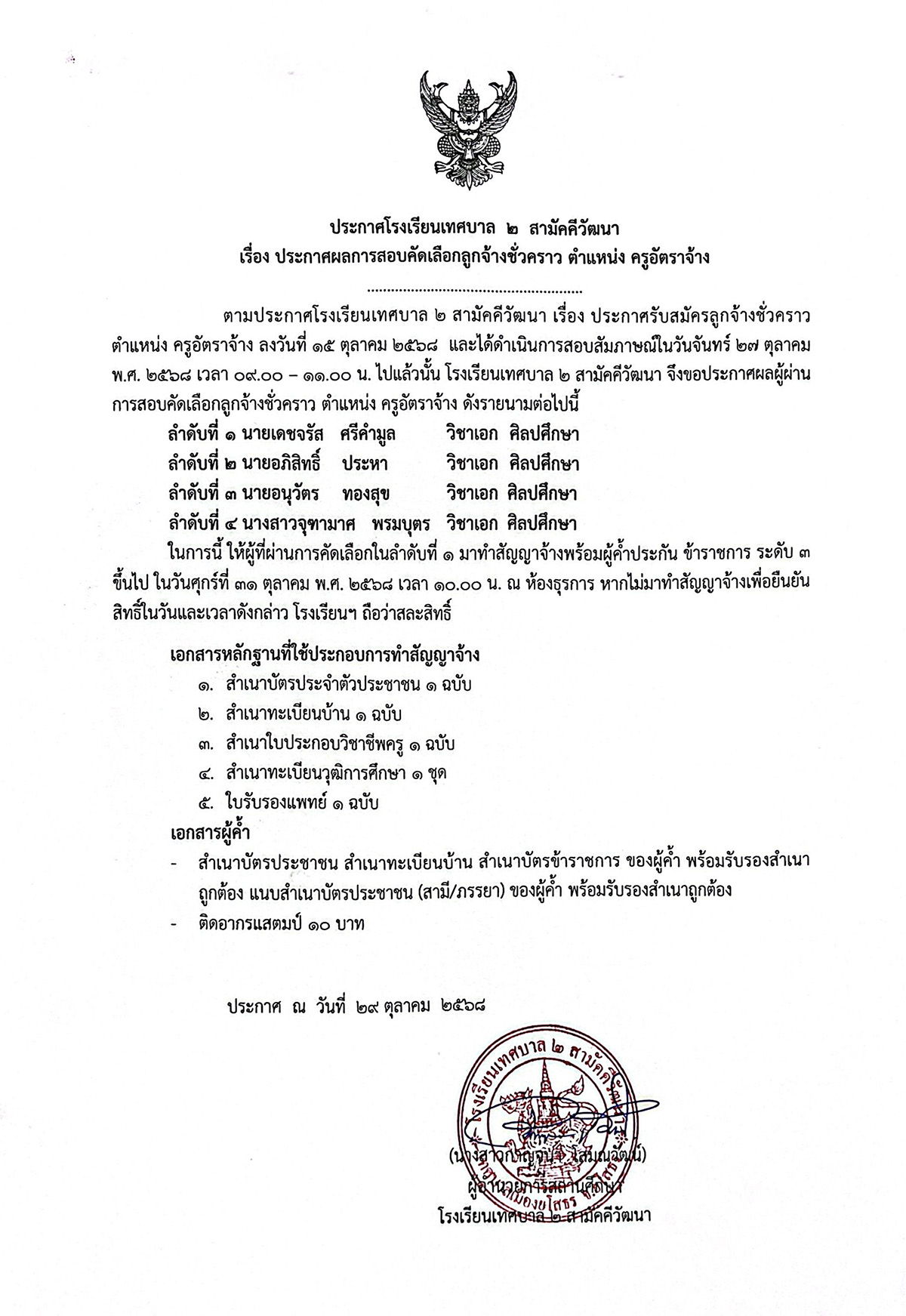 โรงเรียนเทศบาล 2 สามัคคีวัฒนา โดย ดร.กาญจนา โสมณวัฒน์ ผู้อำนวยการโรงเรียน นายอภิรักษ์ นาเมืองน้อย, นางสาววนิดา เทศนอก รองผู้อำนวยการ ได้เป็นตัวแทน โรงเรียน มอบของใช้อุปโภค-บริโภค และสิ่งของเครื่องใช้ไปสมทบช่วยเหลือพี่น้อง ที่ประสพภัยจากความขัดแย้งฯ เพื่อช่วยเหลือและ เป็นกำลังเสริมให้กับผู้ที่อยู่แนวหน้า คอยคุ้มครองป้องภัยให้ประเทศชาติและพี่น้องไทยผู้ประสพภัย